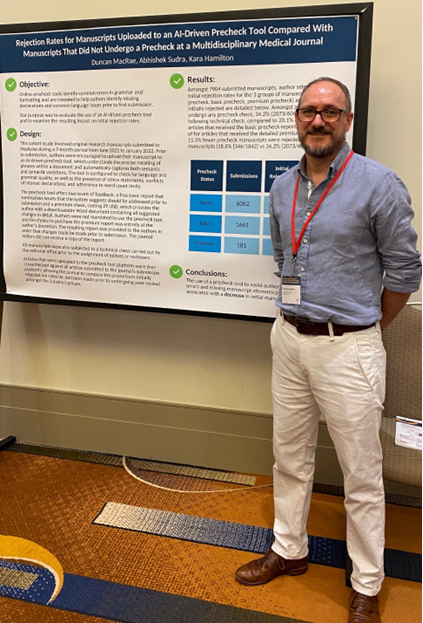 Day 3 also featured exhibits of a new set of poster presentations. One of the posters was by Duncan MacRae, Director, Editorial Strategy and Publishing Policy, Wolters Kluwer Health. The study was co-authored by CACTUS and presented an evaluation of the use of Paperpal Preflight, an AI-driven, free automated web-based tool created by CACTUS to aid in detection of common issues that arise during manuscript preparation, and its effect on initial rejection rates.