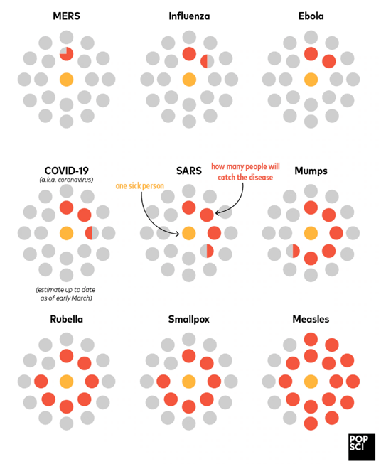 Then, this simple graphic by Sara Chodosh posted on Popular Science shows how measles, smallpox, rubella, mumps, and SARS are much more contagious than coronavirus (COVID-19)! Now that’s the power of an infographic! (It should be noted that this doesn’t imply that measles is more fatal; it’s just that the world has dealt with diseases that are far more contagious, and the real challenge with the coronavirus is finding the right treatment and cure.)